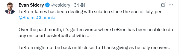 Rob Murrows报道称,湖人的目标是让詹姆斯在11月6日对阵马刺的比赛中迎来复出;不过Evan Sidery表示:在过去的一个月里,情况变得更糟,勒布朗无法进行任何场上篮球活动, 勒布朗可能要等到接近感恩节(11月27日)时才能完全康复。