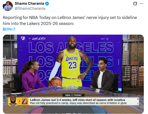 目前詹姆斯正遭遇坐骨神经痛的困扰,今日shams在节目中表示:据我所知,詹姆斯的伤势最初发生在七月底八月初,当时他正在进行球场训练,这意味着至今两个半月以来,他始终在与这个问题进行抗争,甚至在湖人9月30日媒体日和训练营开启之前,有消息称詹姆斯已有一个多月没怎么碰篮球,这显然不是他的常规模式。